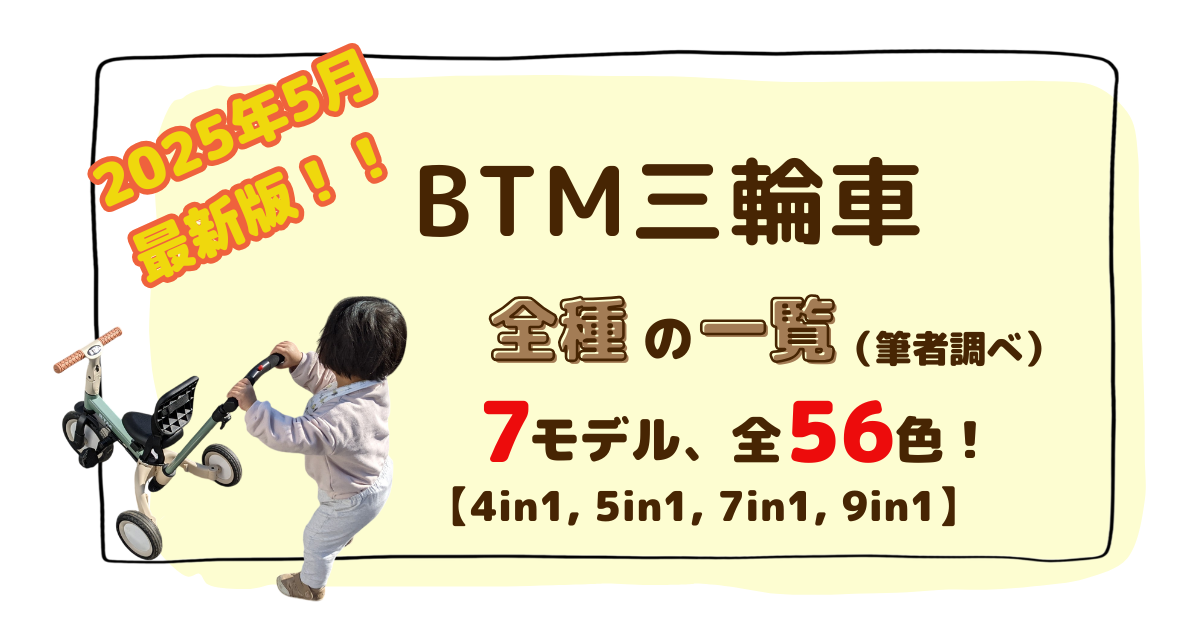 デザインも機能性も良く、コスパ最強なBTMの三輪車ですが、デザイン、モデルが多すぎて、イマイチ違いが分からない方に向けて、この記事を書いてみました。